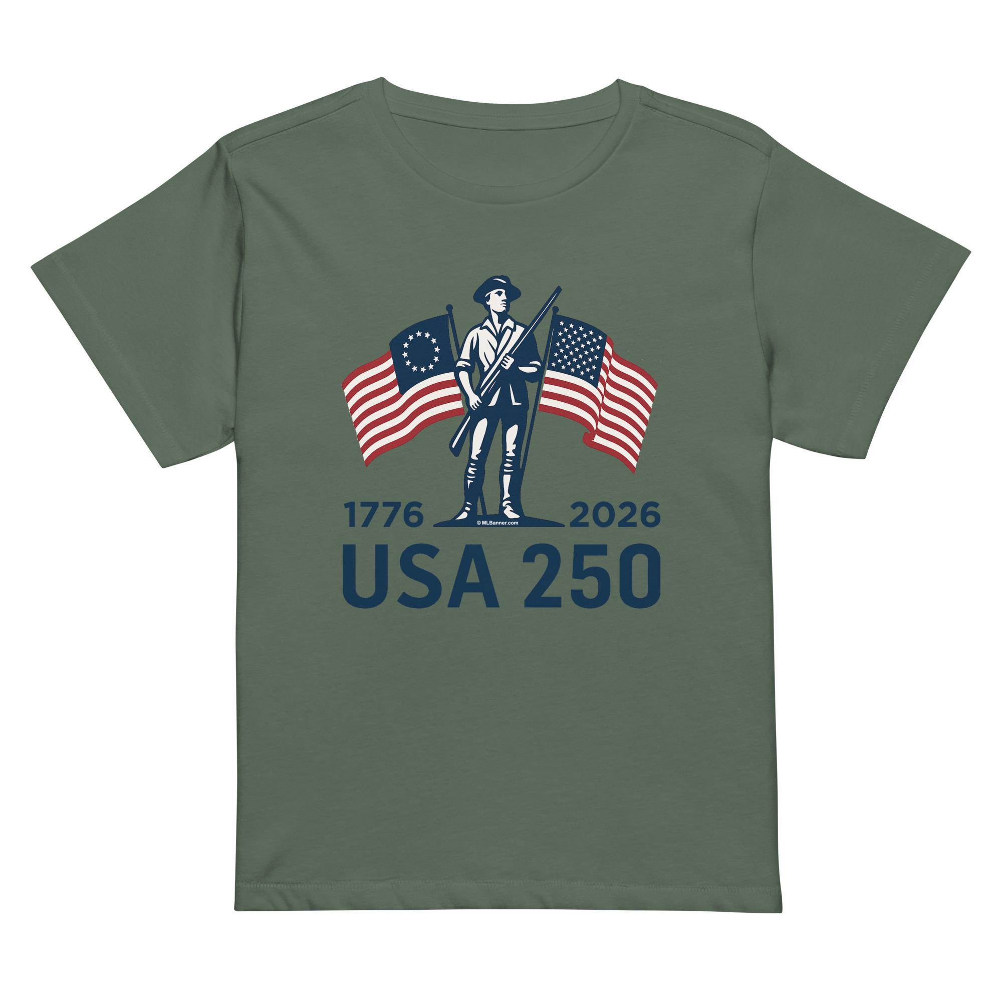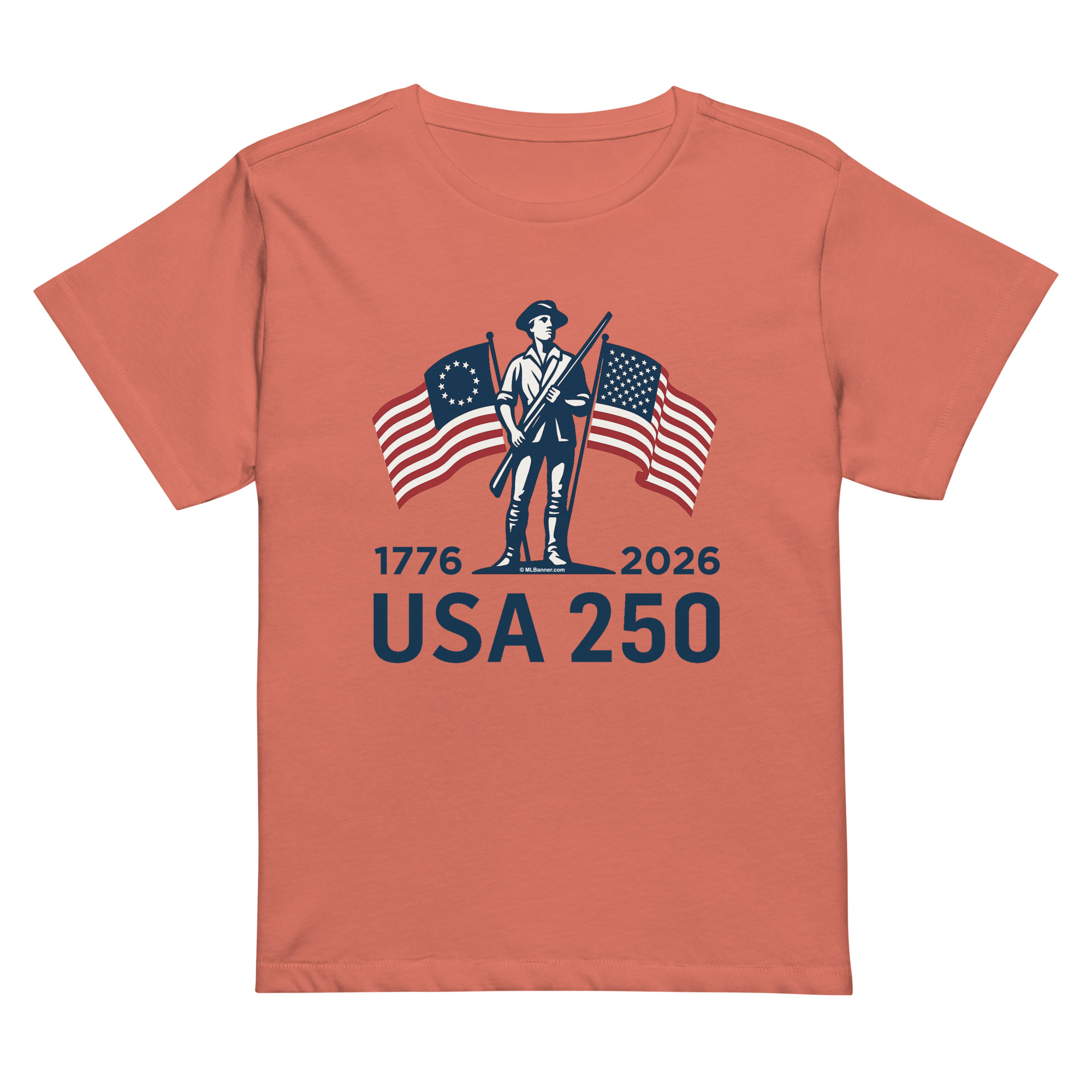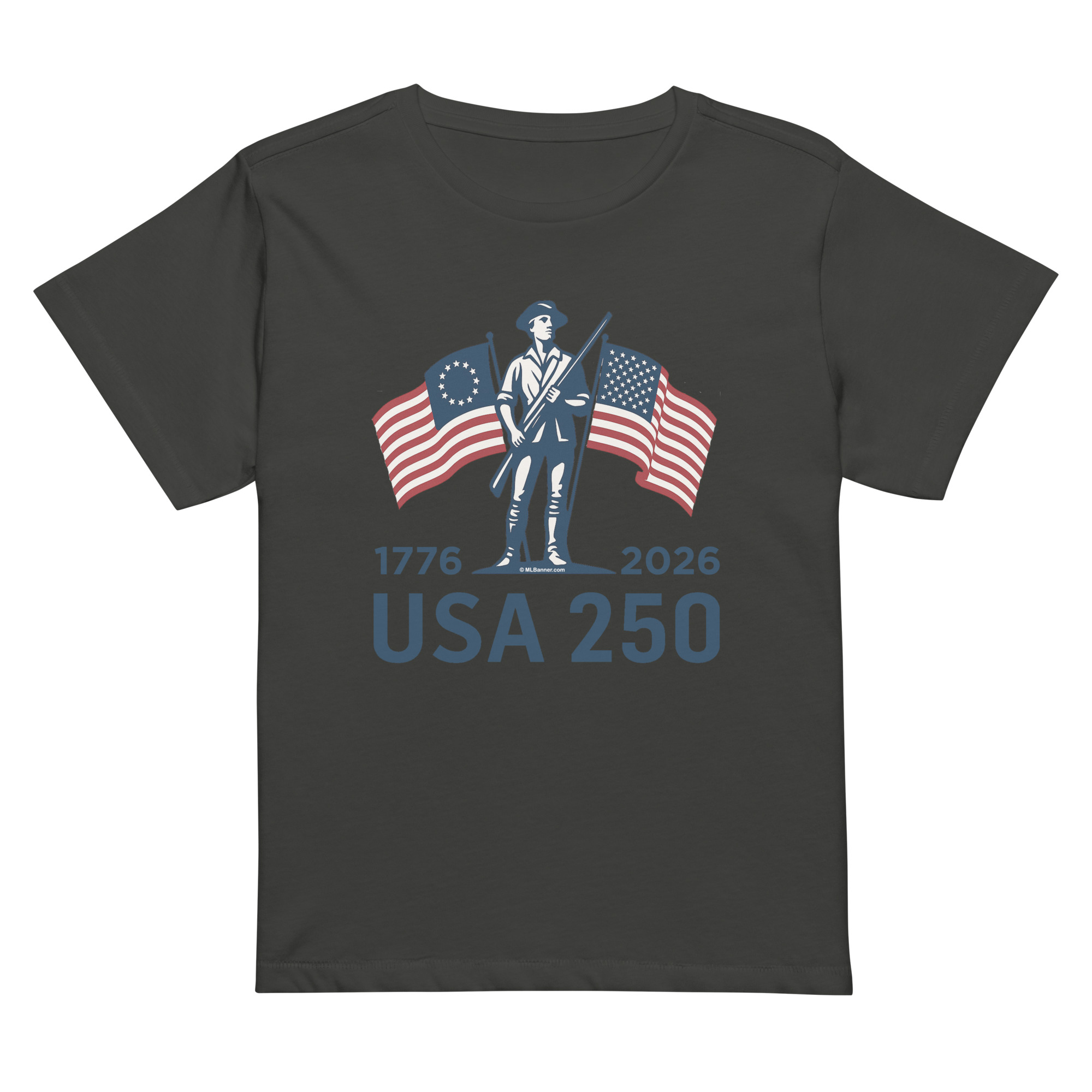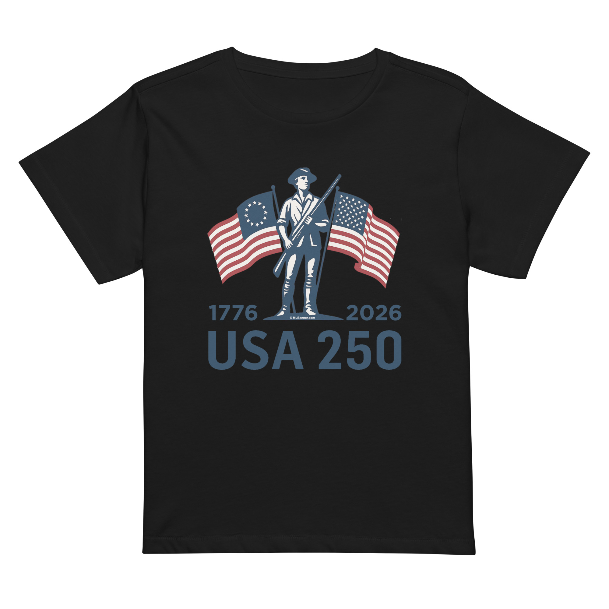 Celebrate the Semiquincentennial in this ML Banner exclusive, semi-fitted, USA 250 tee. Specifically designed to skim your body and give you a flattering look without feeling tight. The soft, lightweight fabric makes it easy to cheer on July 4th fireworks, wave an American flag at a parade, or simply show your patriotic flair during America’s 250th anniversary.
